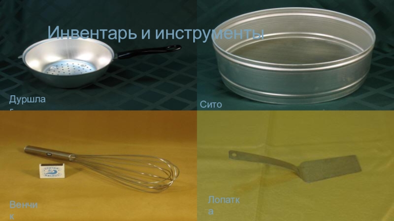 Специальный инвентарь и инструменты: котлы, кастрюли, сотейники, противни, сита, весёлки, венчики, сита и формы.