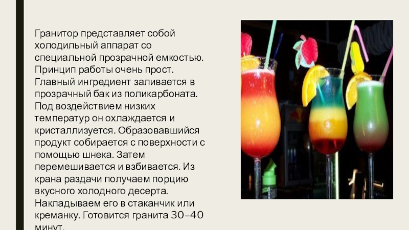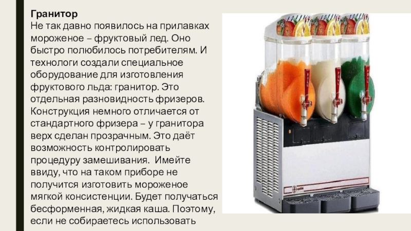 Слайд 25Гранитор представляет собой холодильный аппарат со специальной прозрачной емкостью. Принцип работы