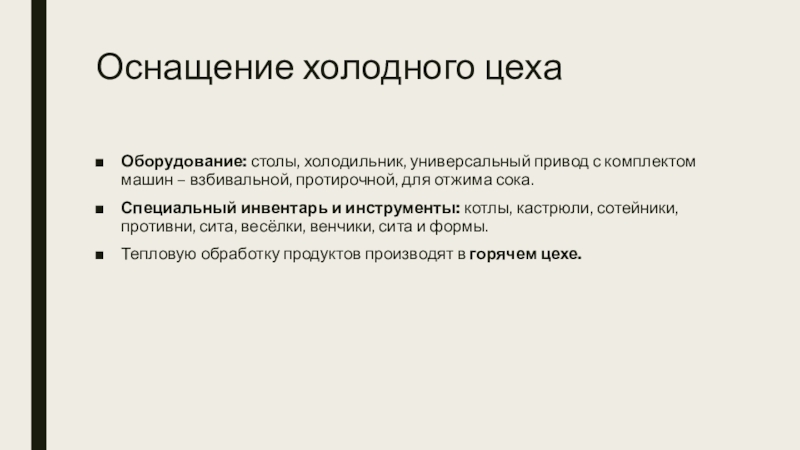 Слайд 9Оснащение холодного цеха