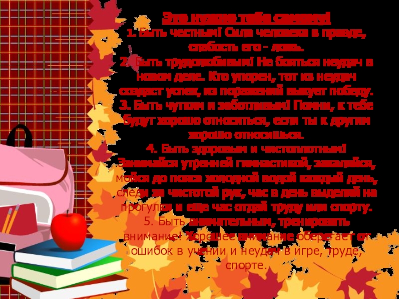 5. Быть внимательным, тренировать внимание! Хорошее внимание оберегает от ошибок в учении и неудач в игре, труде, спорте.