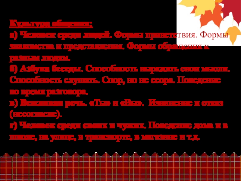 б) Азбука беседы. Способность выражать свои мысли. Способность слушать. Спор, но не ссора. Поведение во время разговора.