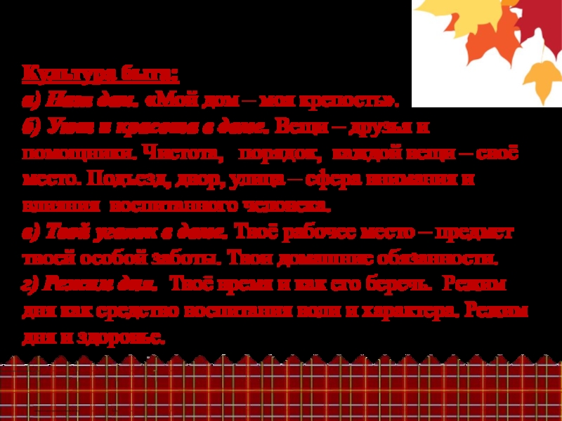 красота в доме. Вещи – друзья и помощники. Чистота, порядок, каждой вещи – своё место. Подъезд, двор, улица – сфера внимания и влияния воспитанного человека.
