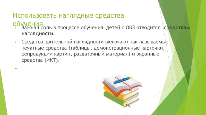 Средства зрительной наглядности включают так называемые печатные средства (таблицы, демонстрационные карточки, репродукции картин, раздаточный материал) и экранные средства (ИКТ).