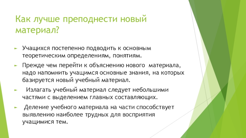 Излагать учебный материал следует небольшими частями с выделением главных составляющих.