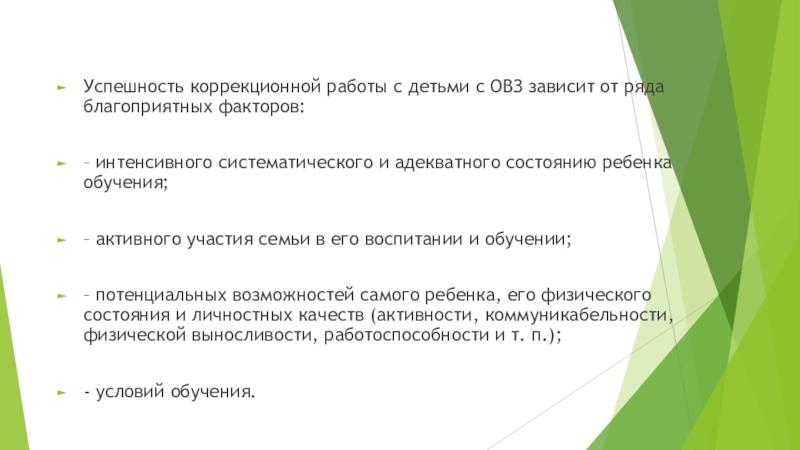 Слайд 18Успешность коррекционной работы с детьми с ОВЗ зависит от ряда благоприятных