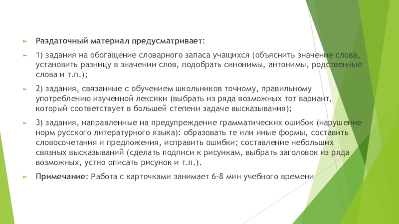 Достоинством заданий по карточкам является наличие в раздаточном материале упражнений различной степени трудности, чтс способствует реализации принципа дифференцированного обучения