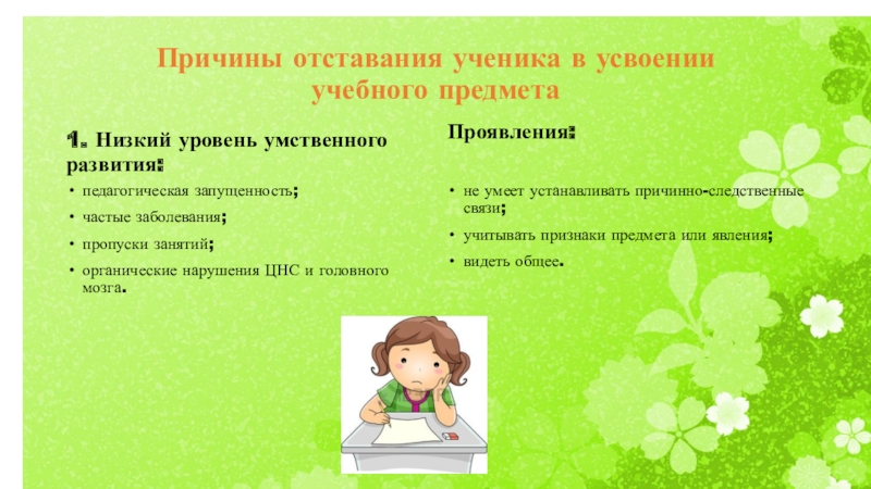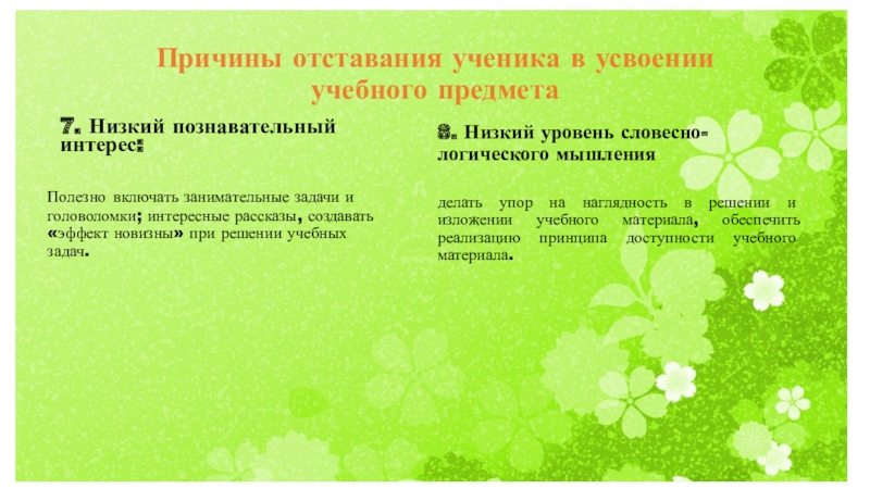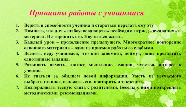 делать упор на наглядность в решении и изложении учебного материала, обеспечить реализацию принципа доступности учебного материала.