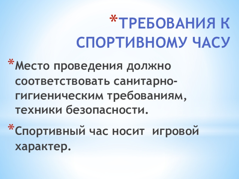 Слайд 6Требования к спортивному часу