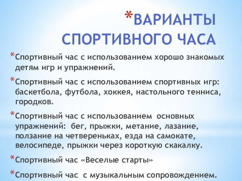 Слайд 9Варианты спортивного часа