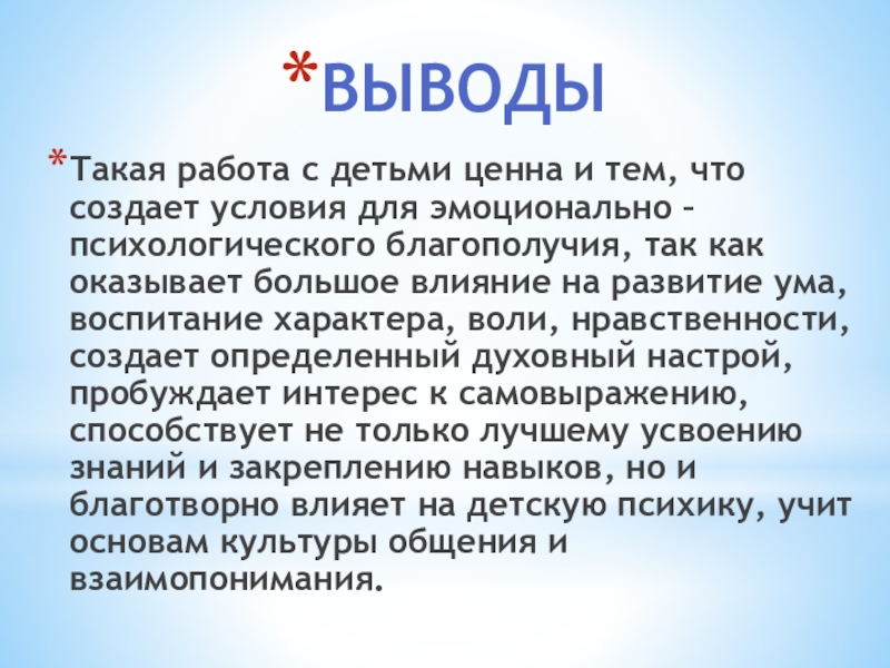 эмоционально – психологического благополучия, так как оказывает большое влияние на развитие ума, воспитание характера, воли, нравственности, создает определенный духовный настрой, пробуждает интерес к самовыражению, способствует не только лучшему усвоению знаний и закреплению навыков, но и благотворно влияет на детскую психику, учит основам культуры общения и взаимопонимания.