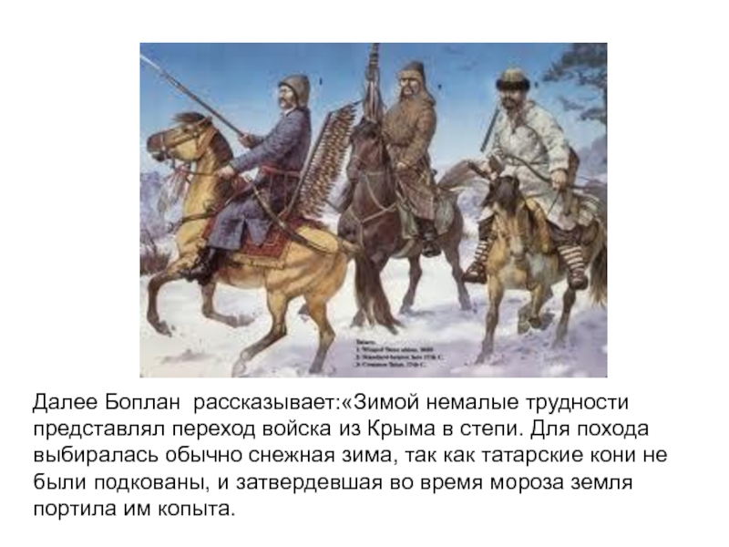 Слайд 16Далее Боплан рассказывает:«Зимой немалые трудности представлял переход войска из Крыма в