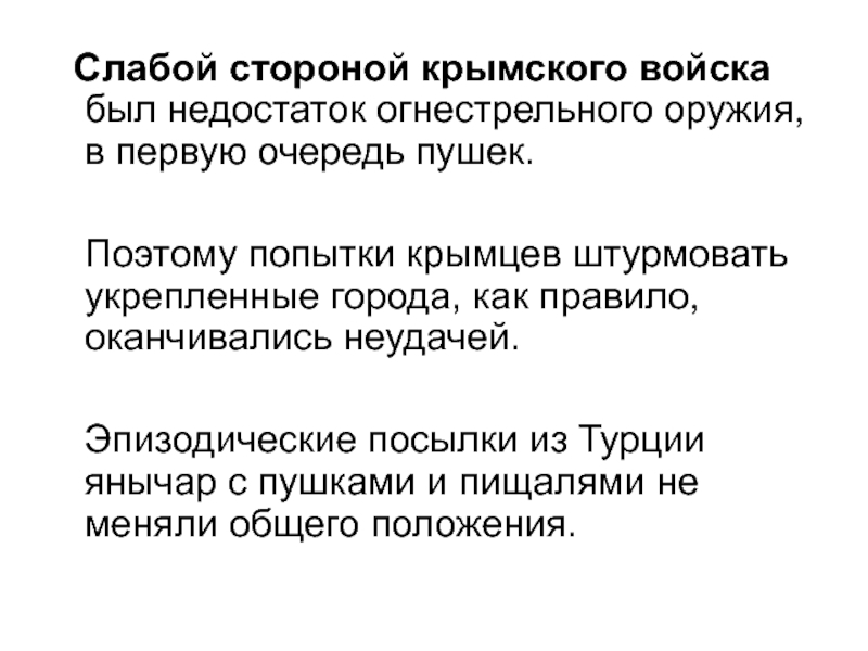 Слайд 12 Слабой стороной крымского войска был недостаток огнестрельного оружия, в первую