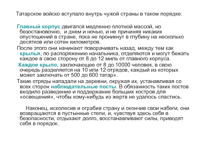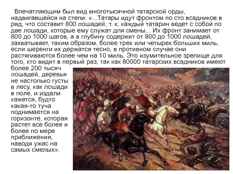 Слайд 18 Впечатляющим был вид многотысячной татарской орды, надвигавшейся на степи: «...Татары