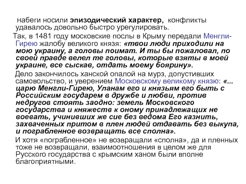И хотя «пограбленное» не возвращали «сполна», да и пленных тоже не возвращали, взаимоотношения в целом же для Русского государства с крымским ханом были вполне благоприятными.