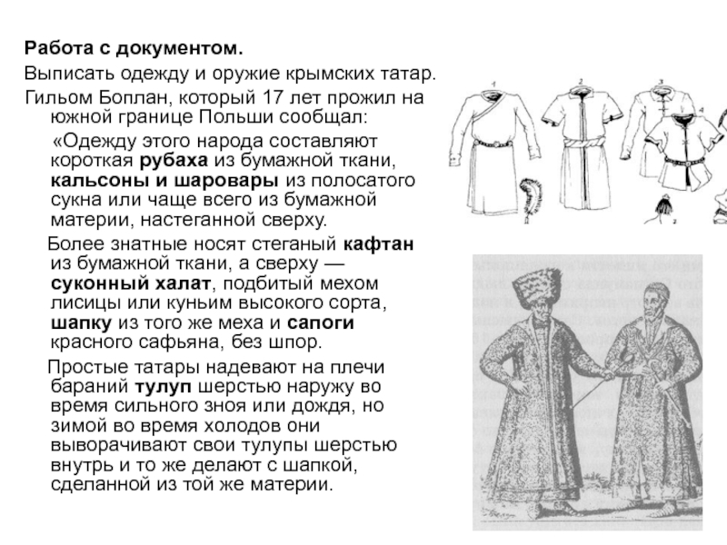 Простые татары надевают на плечи бараний тулуп шерстью наружу во время сильного зноя или дождя, но зимой во время холодов они выворачивают свои тулупы шерстью внутрь и то же делают с шапкой, сделанной из той же материи.