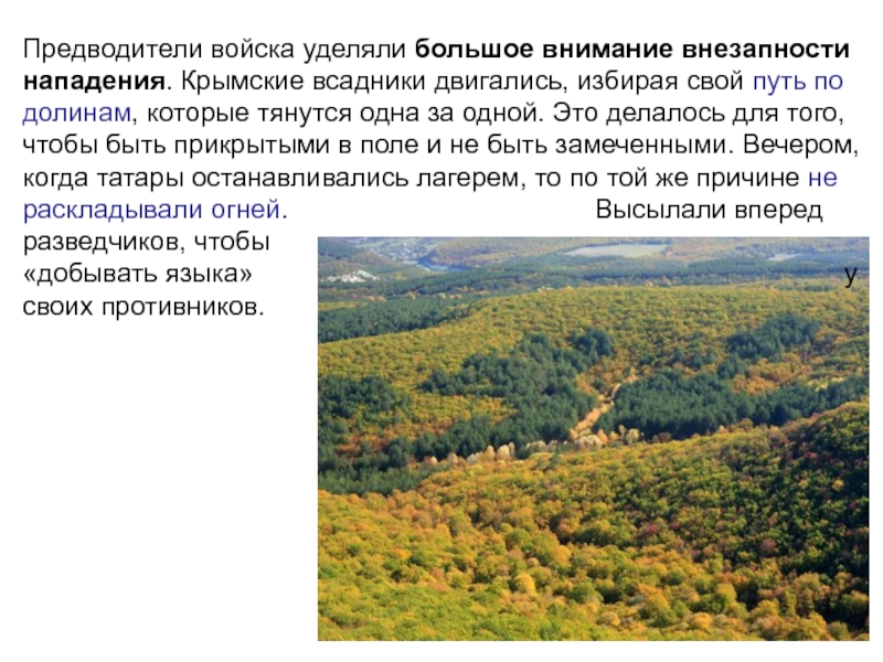Слайд 17Предводители войска уделяли большое внимание внезапности нападения. Крымские всадники двигались, избирая