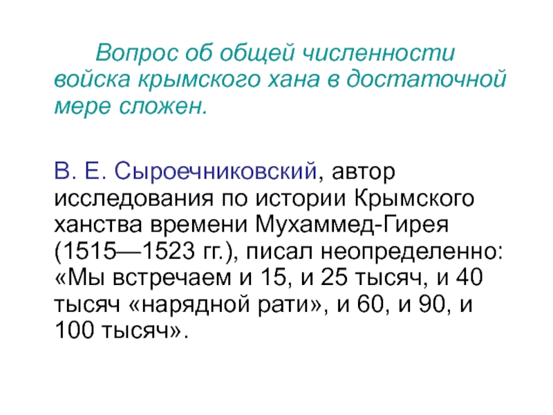 В. Е. Сыроечниковский, автор исследования по истории Крымского ханства времени Мухаммед-Гирея (1515—1523 гг.), писал неопределенно: «Мы встречаем и 15, и 25 тысяч, и 40 тысяч «нарядной рати», и 60, и 90, и 100 тысяч».