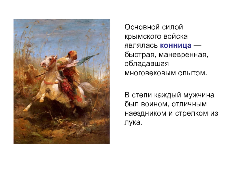 Слайд 10 Основной силой крымского войска являлась конница — быстрая, маневренная,