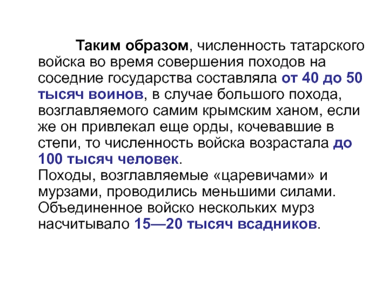 соседние государства составляла от 40 до 50 тысяч воинов, в случае большого похода, возглавляемого самим крымским ханом, если же он привлекал еще орды, кочевавшие в степи, то численность войска возрастала до 100 тысяч человек.