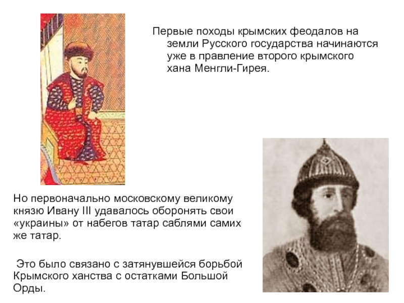 Слайд 21Первые походы крымских феодалов на земли Русского государства начинаются уже в