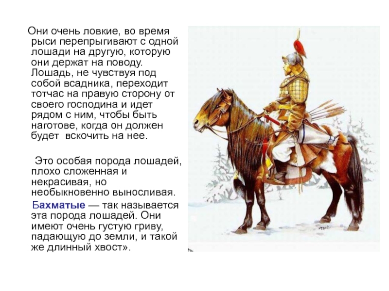 Бахматые — так называется эта порода лошадей. Они имеют очень густую гриву, падающую до земли, и такой же длинный хвост».