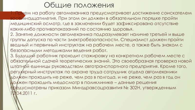 1. Прием на работу автомеханика предусматривает достижение соискателем восемнадцатилетия. При
