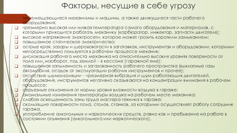 повышенная запыленность и загазованность рабочего пространства (выхлопные газы автомобиля, осадок от эксплуатации рабочих инструментов и прочее);