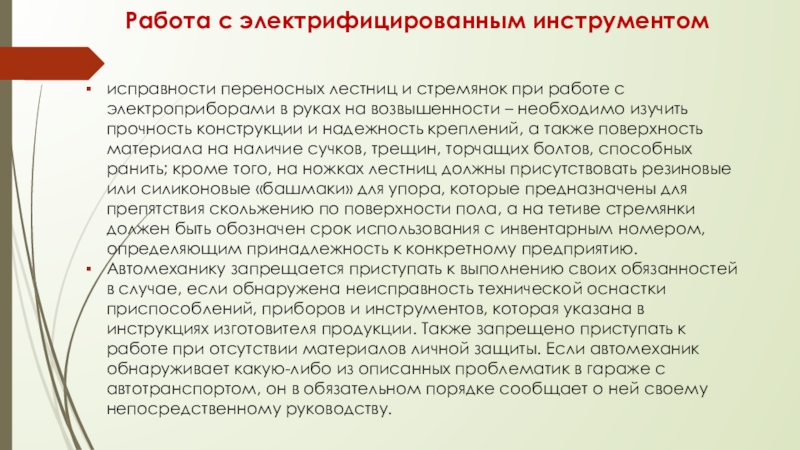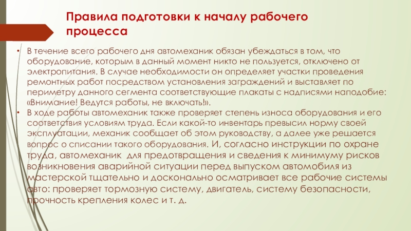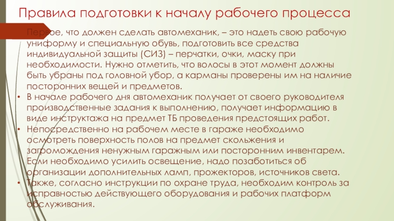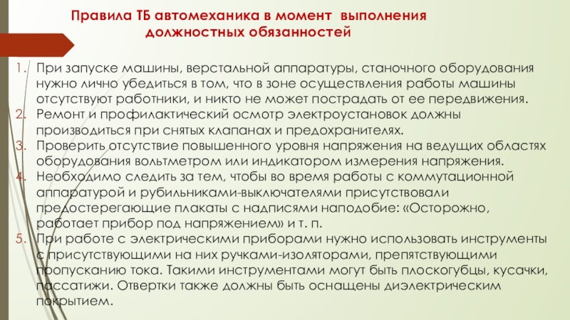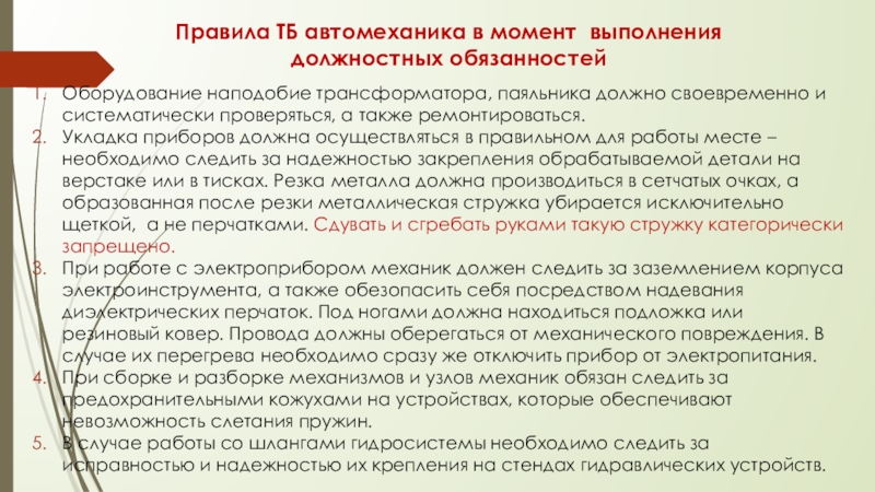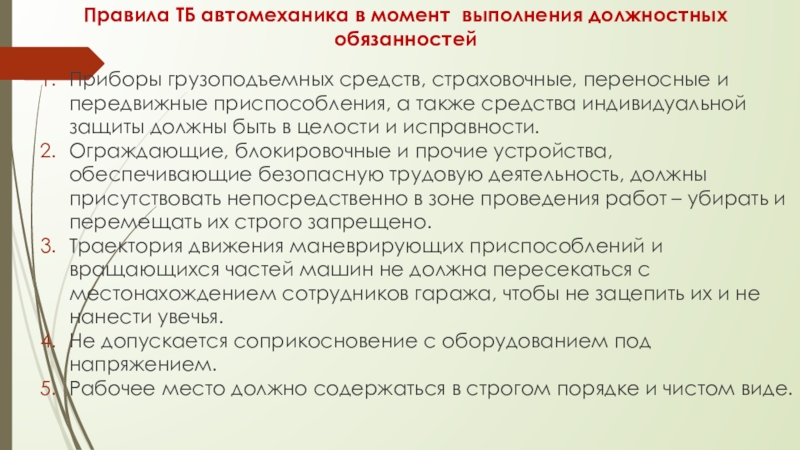 Слайд 13Правила ТБ автомеханика в момент выполнения должностных обязанностей