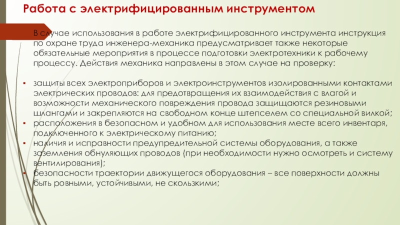 по охране труда инженера-механика предусматривает также некоторые обязательные мероприятия в процессе подготовки электротехники к рабочему процессу. Действия механика направлены в этом случае на проверку: