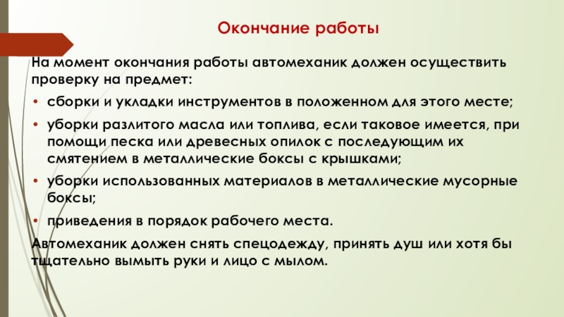 На момент окончания работы автомеханик должен осуществить проверку на предмет: