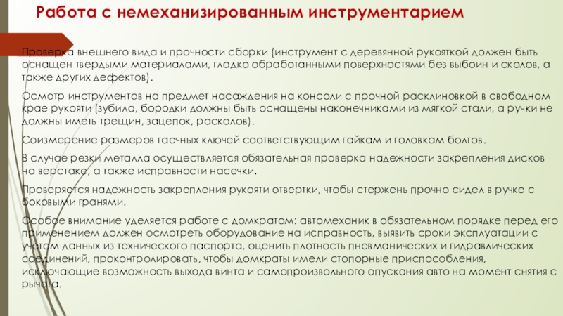 9. Согласно типовой инструкции по охране труда автомеханику в процессе ремонтно-технического обслуживания, нельзя покидать свое рабочее место, без разрешения главного механика. Рядовой сотрудник не должен также выполнять ту работу, которая ему не поручена руководством.