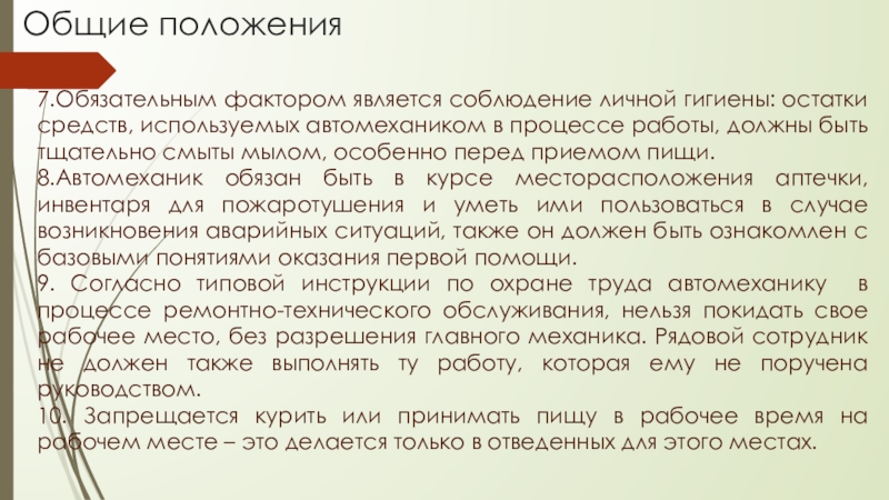7.Обязательным фактором является соблюдение личной гигиены: остатки средств, используемых автомехаником