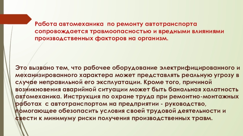 Работа автомеханика по ремонту автотранспорта сопровождается травмоопасностью и вредными влияниями производственных