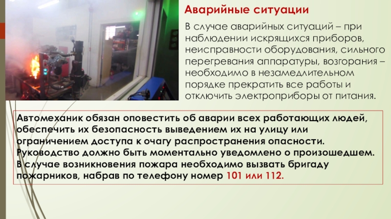 Автомеханик обязан оповестить об аварии всех работающих людей, обеспечить их безопасность выведением их на улицу или ограничением доступа к очагу распространения опасности. Руководство должно быть моментально уведомлено о произошедшем. В случае возникновения пожара необходимо вызвать бригаду пожарников, набрав по телефону номер 101 или 112.
