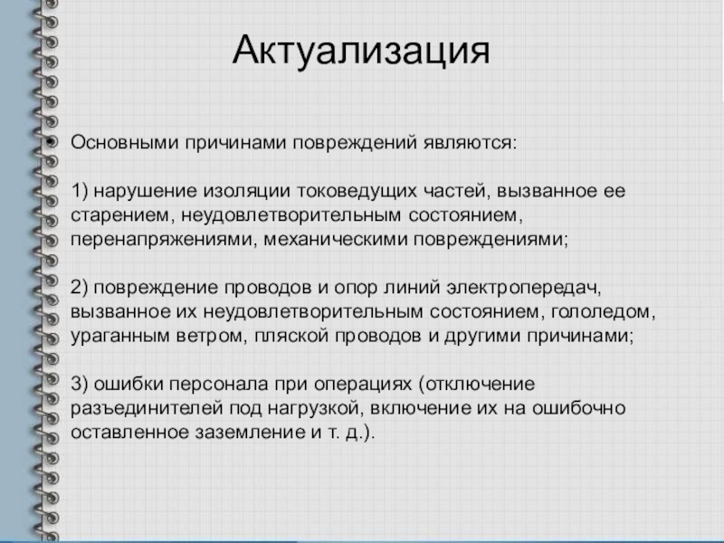 2) повреждение проводов и опор линий электропередач, вызванное их неудовлетворительным состоянием, гололедом, ураганным ветром, пляской проводов и другими причинами;