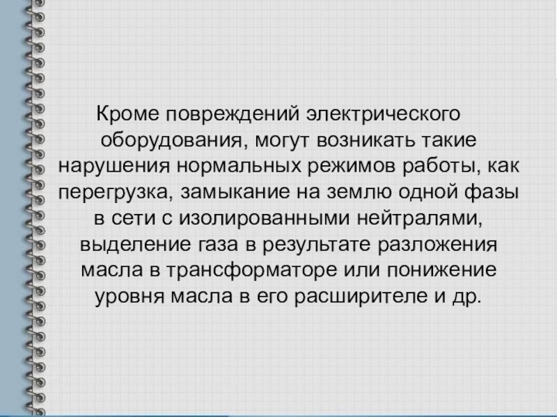 как перегрузка, замыкание на землю одной фазы в сети с изолированными нейтралями, выделение газа в результате разложения масла в трансформаторе или понижение уровня масла в его расширителе и др.