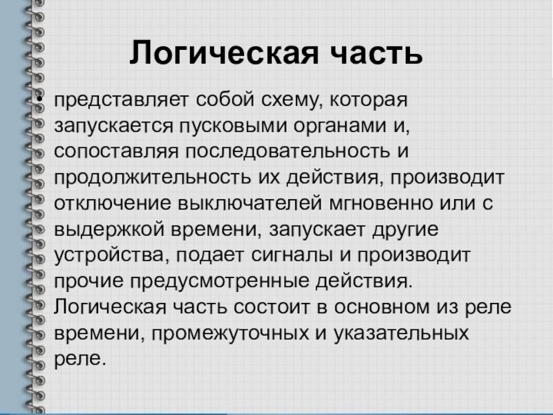 последовательность и продолжительность их действия, производит отключение выключателей мгновенно или с выдержкой времени, запускает другие устройства, подает сигналы и производит прочие предусмотренные действия. Логическая часть состоит в основном из реле времени, промежуточных и указательных реле.