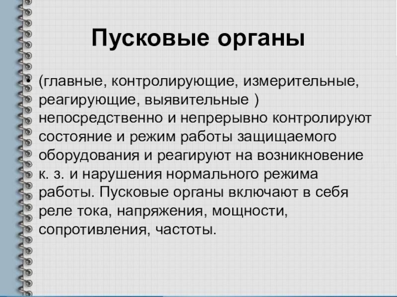 состояние и режим работы защищаемого оборудования и реагируют на возникновение к. з. и нарушения нормального режима работы. Пусковые органы включают в себя реле тока, напряжения, мощности, сопротивления, частоты.