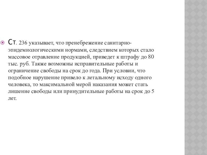 Слайд 26Ст. 236 указывает, что пренебрежение санитарно-эпидемиологическими нормами, следствием которых стало массовое