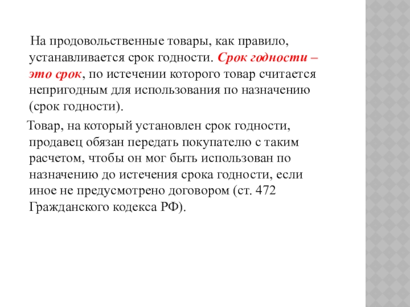 Слайд 20 На продовольственные товары, как правило, устанавливается срок годности. Срок