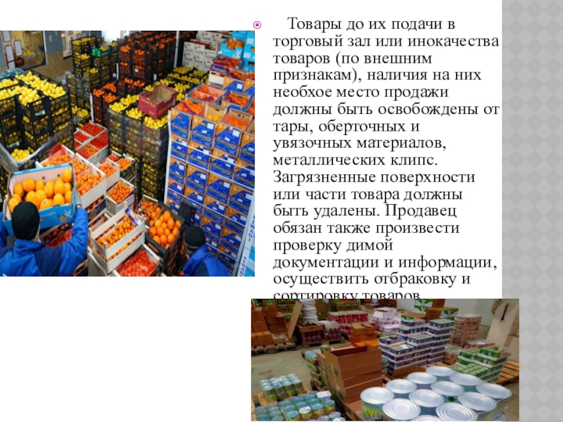 Слайд 12 Товары до их подачи в торговый зал или инокачества