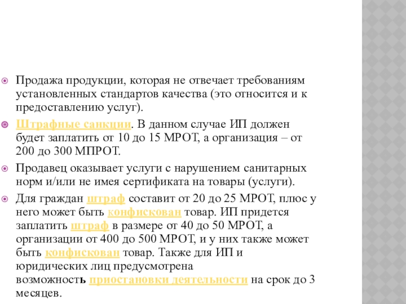 Слайд 23Продажа продукции, которая не отвечает требованиям установленных стандартов качества (это относится