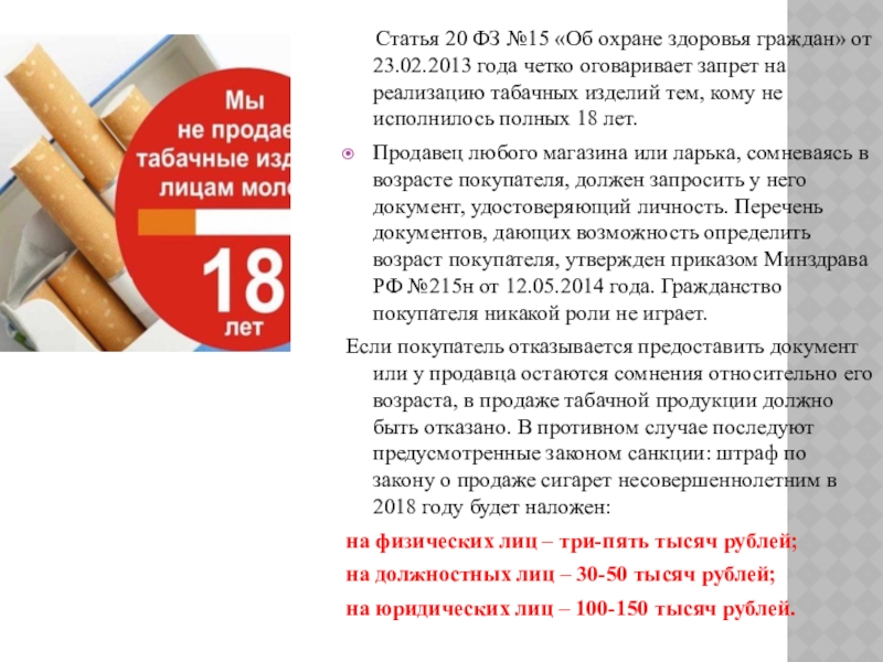 от 23.02.2013 года четко оговаривает запрет на реализацию табачных изделий тем, кому не исполнилось полных 18 лет.