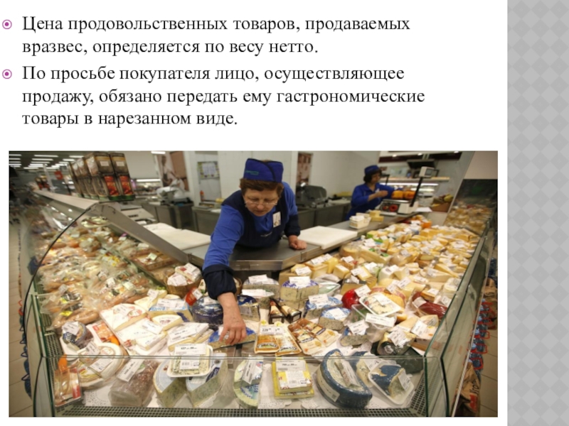 Слайд 16Цена продовольственных товаров, продаваемых вразвес, определяется по весу нетто.
