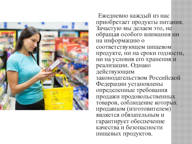 Слайд 2 Ежедневно каждый из нас приобретает продукты питания. Зачастую мы