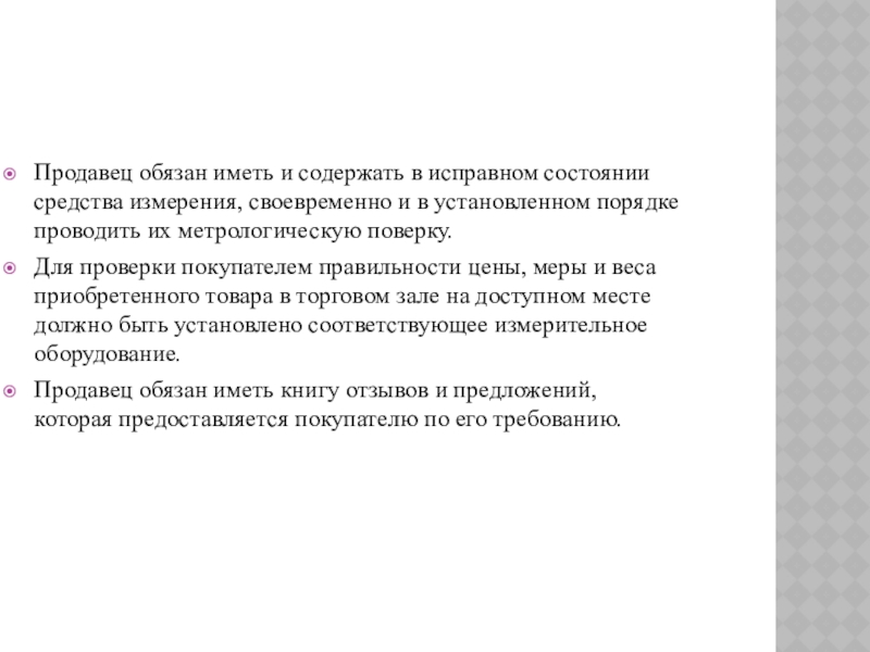 Слайд 6Продавец обязан иметь и содержать в исправном состоянии средства измерения, своевременно