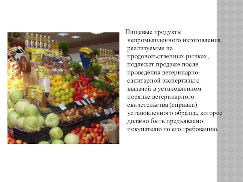 Слайд 13 Пищевые продукты непромышленного изготовления, реализуемые на продовольственных рынках, подлежат