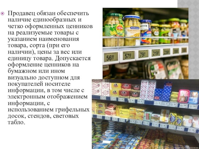 Слайд 8Продавец обязан обеспечить наличие единообразных и четко оформленных ценников на реализуемые