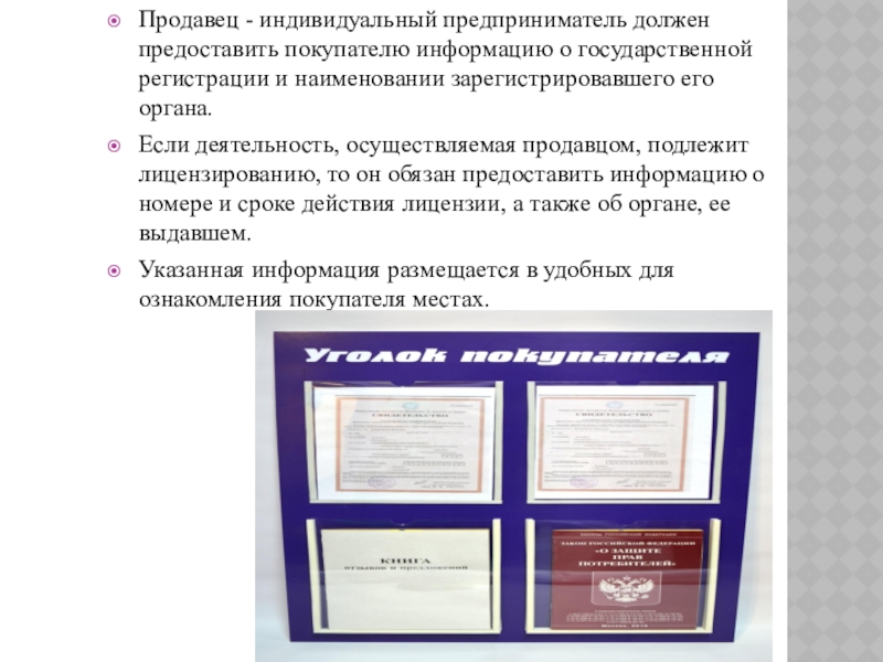 Слайд 7Продавец - индивидуальный предприниматель должен предоставить покупателю информацию о государственной регистрации