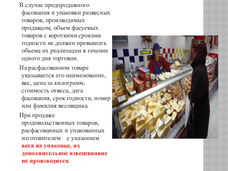 Слайд 14 В случае предпродажного фасования и упаковки развесных товаров, производимых
